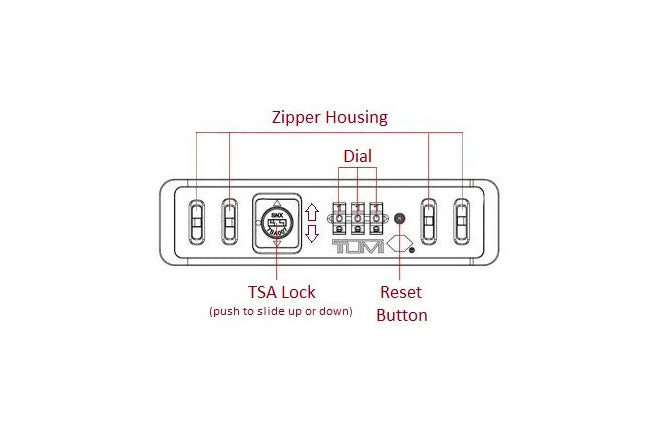 Comienza asegurándote de que cada dígito esté configurado en el código de inicio preestablecido en 0-0- liberando los extractores de cierre de tu maleta. Para hacer esto, desliza el TSA como lo indican las flechas para desbloquear los cierres.
